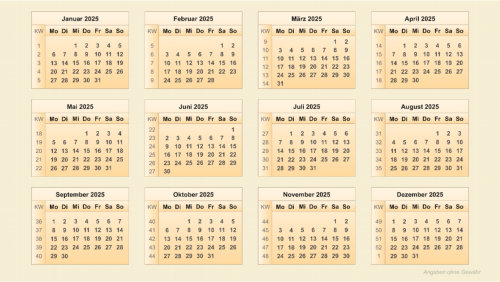 Auf dieser Seite sind alle wichtigen Informationen zum Thema Kalender 2025 zu finden. Der Kalender 2025 beginnt am Mittwoch, den 1. Januar 2025 und endet am Mittwoch, den 31. Dezember 2025. Das Kalenderjahr 2025 ist kein Schaltjahr, das heißt dass der Jahreskalender 2025 ganz normal 365 Kalendertage hat und der Februar 2025 mit dem 28. Kalendertag endet. Ein Schaltjahr findet nur alle 4 Jahre statt. #kalender2025Im Jahr 2025 beginnt die 1. Kalenderwoche am Montag, den 30. Dezember des Vorjahres. Das Kalenderjahr 2025 hat insgesamt 52 Kalenderwochen. Die 52. kw 2025 endet am Sonntag, den 28. Dezember 2025. Die Kalenderwoche, die den ersten Donnerstag enthält ist die KW 1 im Jahr. Ein Jahr hat entweder 52 oder 53 Kalenderwochen. Eine Kalenderwoche hat immer 7 Tage und beginnt mit einem Montag. #2025Auf dieser Internetseite ist der Jahreskalender 2025 nach den einzelnen Monaten angeordnet. So können alle Wochentage 2025 und Kalendertage 2025 schnell gefunden werden. Die Übersicht zeigt den Kalender Januar 2025, den Kalender Februar 2025, den Kalender März 2025, sowie den Kalender April 2025, den Kalender Mai 2025, den Kalender Juni 2025, den Kalender Juli 2025, sowie den Kalender August 2025, den Kalender September 2025, den Kalender Oktober 2025, den Kalender November 2025 und den Kalender Dezember 2025. #jahreskalender2025In diesem Kalender 2025 sind auch die Kalenderwochen 2025 zu finden. So kann in dem jeweiligen Monatskalender 2025 bzw. Wochenkalender 2025 oder Tageskalender 2025 immer auch die aktuelle kw 2025 (aktuelle Kalenderwoche 2025) gefunden werden. Es sind alle Kalenderwochen 2025 zu sehen. #2025kalender #kalender25 #kw2025 #kalenderwochen20252025 Kalender als Video: Kalender 2025
